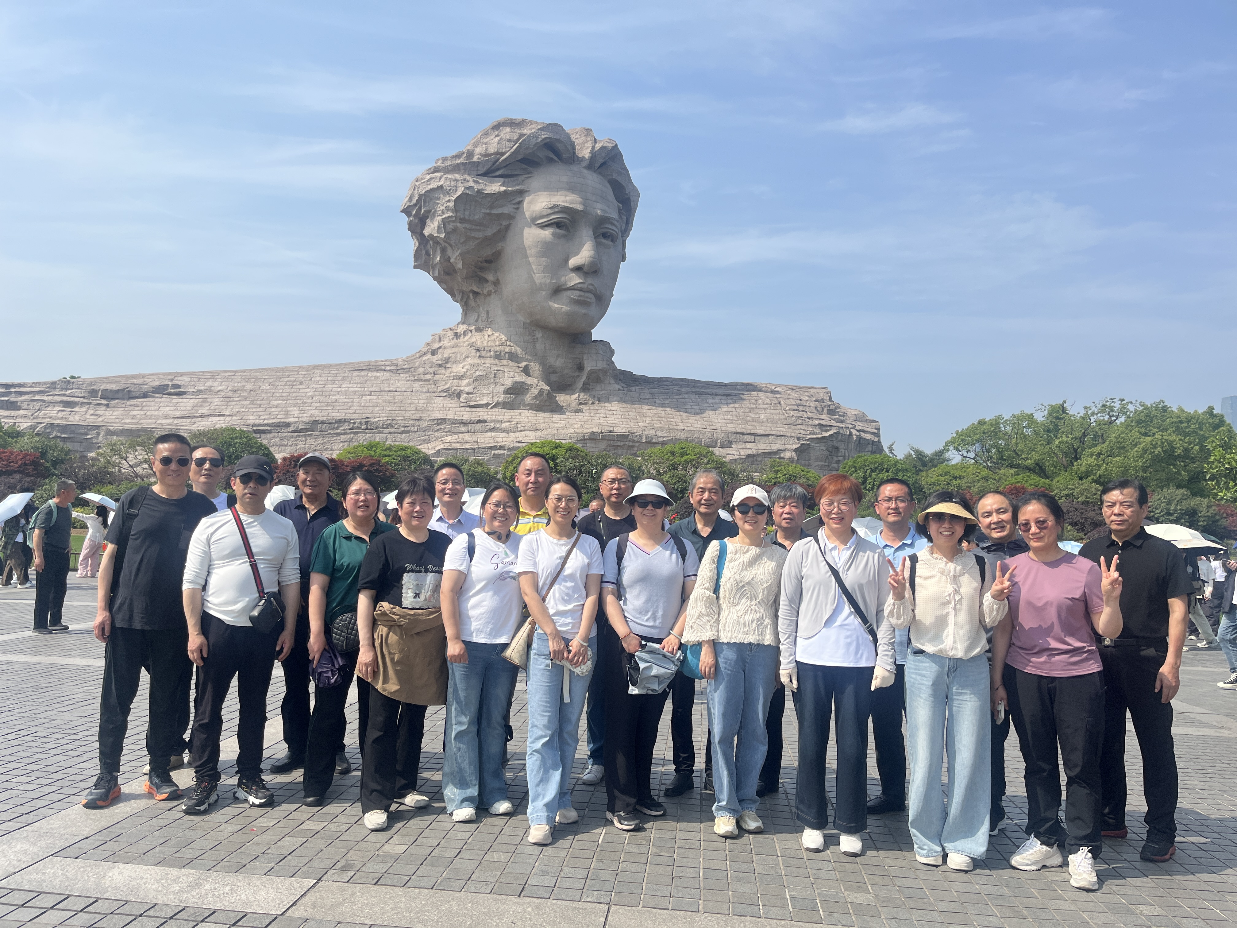 第一天,我們來到了久負(fù)盛名的橘子洲頭。橘子洲位于長沙市岳麓區(qū)湘江中心,是湘江中最大的名洲 ,由南至北,縱貫江心,西瞻岳麓,東臨古城,四面環(huán)水。這里不僅自然風(fēng)光秀麗,更承載著厚重的歷史文化。佇立在洲頭,首先映入眼簾的是宏偉的毛澤東青年藝術(shù)雕塑。雕塑以1925年青年時期的毛澤東形象為基礎(chǔ),高32米,長83米,寬41米,采用鋼筋混凝土框剪結(jié)構(gòu),外表材料為花崗巖石材,是國內(nèi)最大的偉人藝術(shù)雕像 。毛澤東那堅定的目光凝視著遠(yuǎn)方,仿佛在思索著國家的命運(yùn)與未來,讓人不禁聯(lián)想到他當(dāng)年“指點江山,激揚(yáng)文字”的豪邁與壯志。