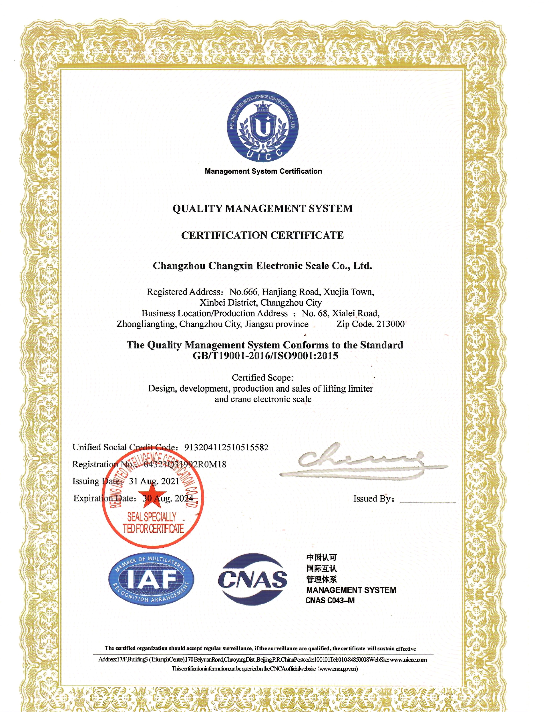 1998年12月,常欣公司率先在同行業(yè)中通過(guò)了IS09001質(zhì)量體系的認(rèn)證。2008年被確認(rèn)為全國(guó)起重機(jī)械標(biāo)準(zhǔn)化技術(shù)委員會(huì)委員,參與制訂